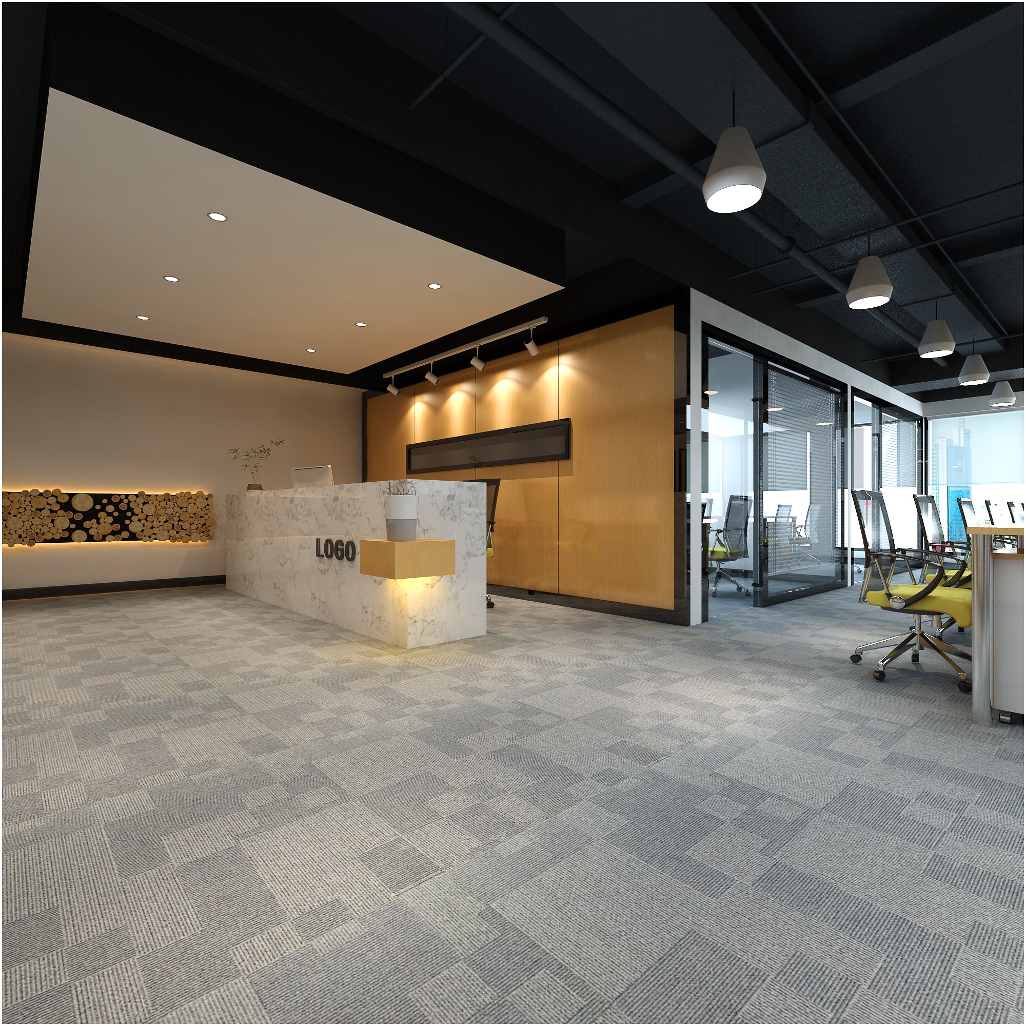 - 接待臺后方可以設(shè)置公司標(biāo)志,以及一些舒適的等候座椅。