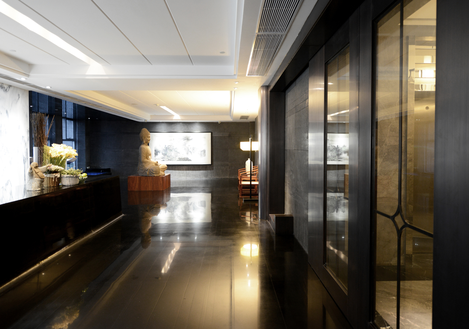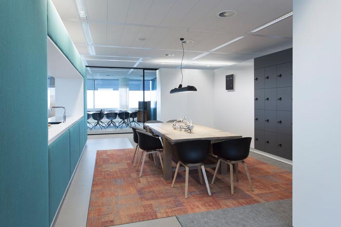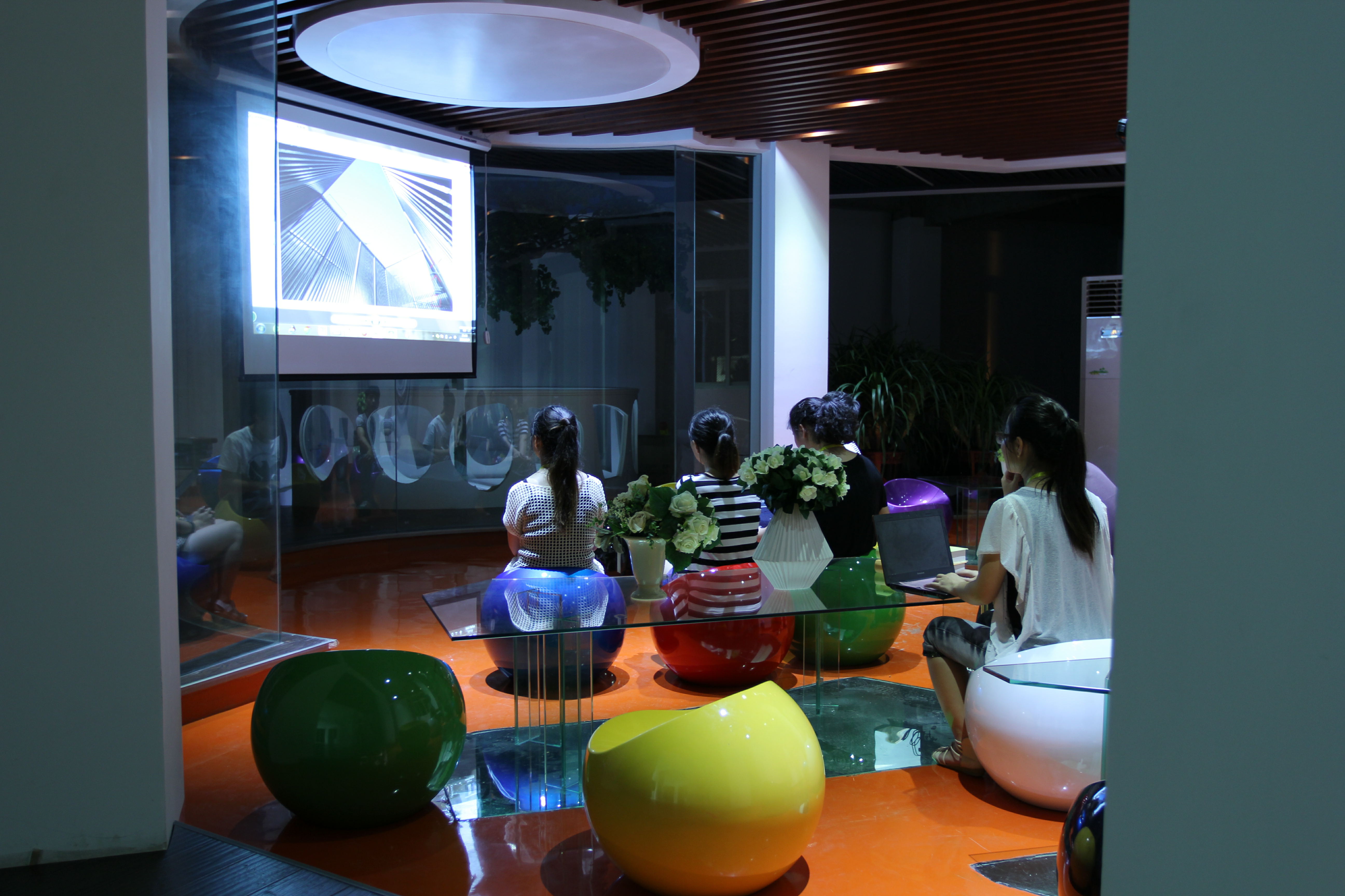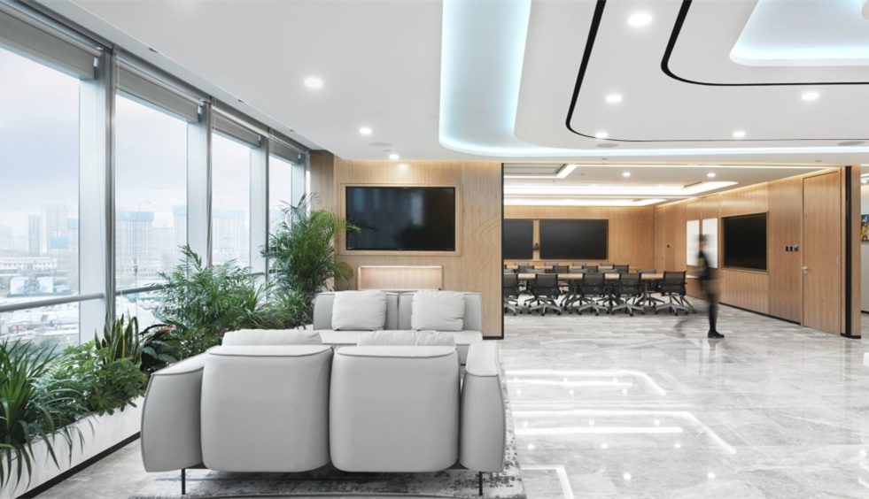 為了打破規(guī)規(guī)矩矩的沉悶感,設計師用到了各種線條元素,如前臺的斜面,休閑區(qū)吊頂上的圓形裝飾,前廳一側的“綠盒子”洽談區(qū),文印區(qū)也是一個盒子造型。